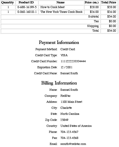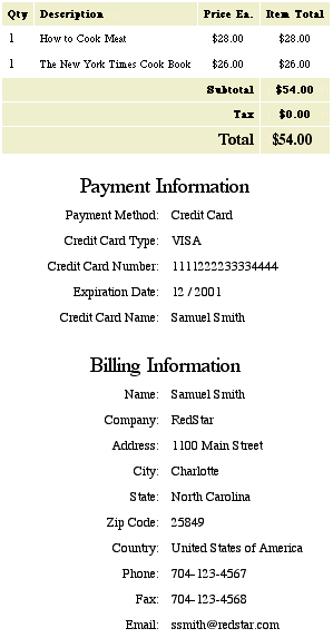In this example, the mgiConfirmOrder tag will display a confirmation screen containing the customer's order, payment, billing, and shipping information with the options defined in the "Books" configuration. Any information that the customer left blank is not displayed.