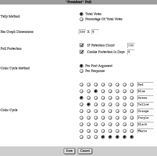 Return to the first screen of the poll interface. Click the "Options" button to access the poll preferences. You may set the method, graph dimensions, protection, color cycle method, and color cycle.