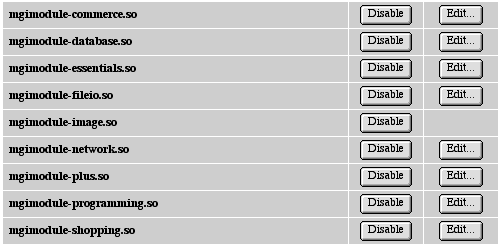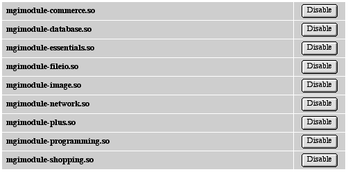 Domain PreferencesDomain preferences allow you to enter virtual host names for the specified domain and enable or disable MGI modules for the specified domain. In the virtual host name box, enter the name of all virtual domains that point to the web site (one per line) and click the "Save" button. For example, for many domains the virtual hosts "domain.com" and "www.domain.com" should be entered. Note: Virtual host field mapping must also be set up in the settings of the web server and cannot be specified in MGI alone. Click the "Return" button to return to the Domain Management window or continue configuring the domain preferences. At the bottom of the Domain Preferences window, the modules available for the web site are listed. The module list does not reflect modules that are disabled at the server level (under Module Management in the MGI Server Admin). By default the web site has access to all modules. To disable the web site's access to a module, click the "Disable" button beside the module. When disabled the module name displays in plain text with a line through the name. To enabled a module, click the "Enable" button beside the module. When enabled the module name displays in bold text. Changes to modules in the Domain Preferences affects only the specified domain and its regions, but does not affect the server module settings or module settings for other domains.