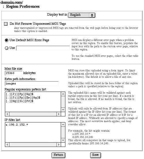Click the "Region Management" link. Select the region to configure for file upload. Highlight the forward slash "/" for the default region or the region name in the region list and click the "Edit" button.