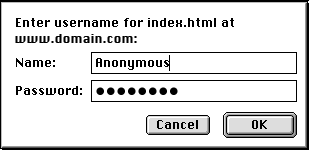 If the Name and Password entered in the dialogue box exactly matches the Username and Password coded in the mgiAuthenticate tag, the index.html page is displayed to the visitor. If the Name and Password entered in the dialogue box do not exactly match the Username and Password coded in the mgiAuthenticate tag, an error page is displayed. Suggested Usage